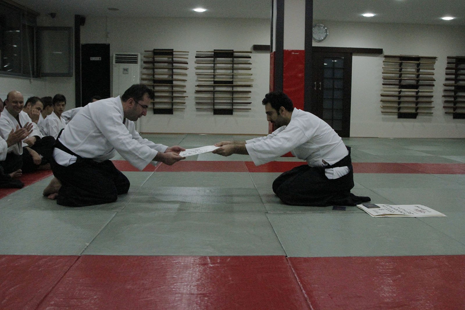 Aikimode Aiki Akademi’nin yeni 1. Dan öğrencileri Aikikai diplomalarını düzenlenen törenle aldı. Diploma töreni öncesi yapılan kıdemli antrenmanına yaklaşık 30 öğrencimiz katıldı. Antrenmanda ”ki” akışı üzerine yoğunlaşarak akıcılığın önemi vurgulandı. Hiç bir şeyin durmadığı hareketin hep var olduğu bir evrende devamlılığın ve daireselliğin önemini vugulayan Oğuzhan Sensei, savaş sanatlarının inceliklerini öğrencilerine anlattı.
