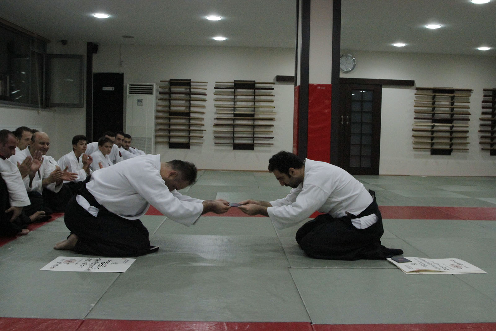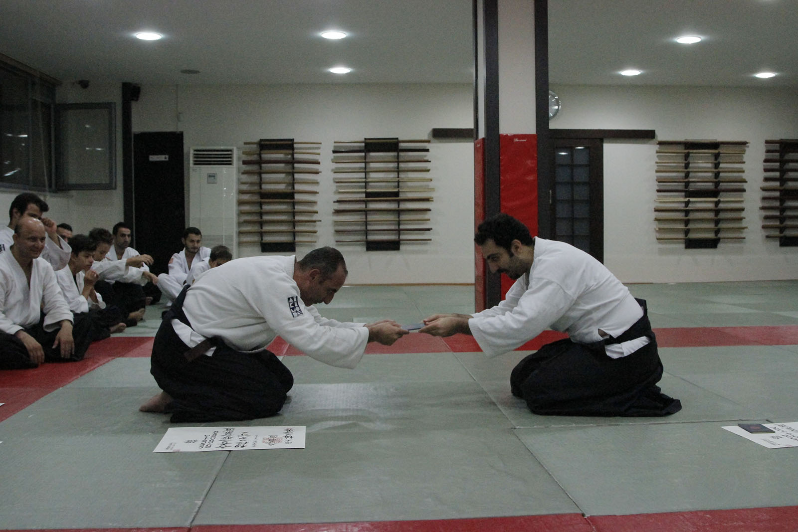 Aikimode Aiki Akademi’nin yeni 1. Dan öğrencileri Aikikai diplomalarını düzenlenen törenle aldı. Diploma töreni öncesi yapılan kıdemli antrenmanına yaklaşık 30 öğrencimiz katıldı. Antrenmanda ”ki” akışı üzerine yoğunlaşarak akıcılığın önemi vurgulandı. Hiç bir şeyin durmadığı hareketin hep var olduğu bir evrende devamlılığın ve daireselliğin önemini vugulayan Oğuzhan Sensei, savaş sanatlarının inceliklerini öğrencilerine anlattı.