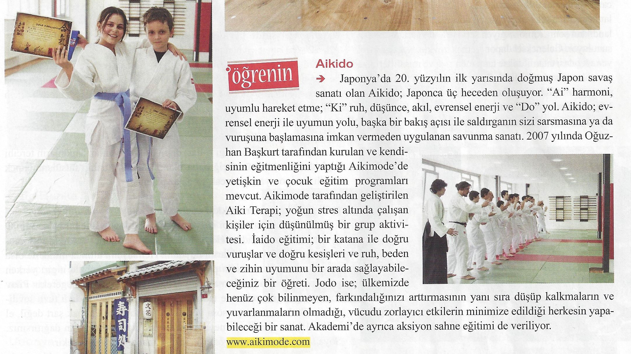 Japonya’da 20.yüzyılın ilk yarısında doğmuş Japon Savaş Sanatı olan Aikido ;Japonca üç heceden oluşuyor . ”Aİ” harmoni , uyumlu hareket etme ; ”Kİ” ruh , düşünce , akıl , evrensel enerji ve ”DO” yol . Aikido ; evrensel enerji ile uyumun yolu , başka bir bakış açısı ile saldırganın sizi sarsmasına ya da vuruşuna başlamasına imkan vermeden uygulanan savaş sanatı. 2007 yılında Oğuzhan Başkurt tarafından kurulan ve kendisinin eğitmenliğini yaptığı Aikimode’de çocuk ve yetişkin aikido programları mevcut . Aikimode tarafından geliştirilen AİKi TERAPİ ; yoğun stres altında çalışan kişiler için düşünülmüş bir grup aktivitesi.