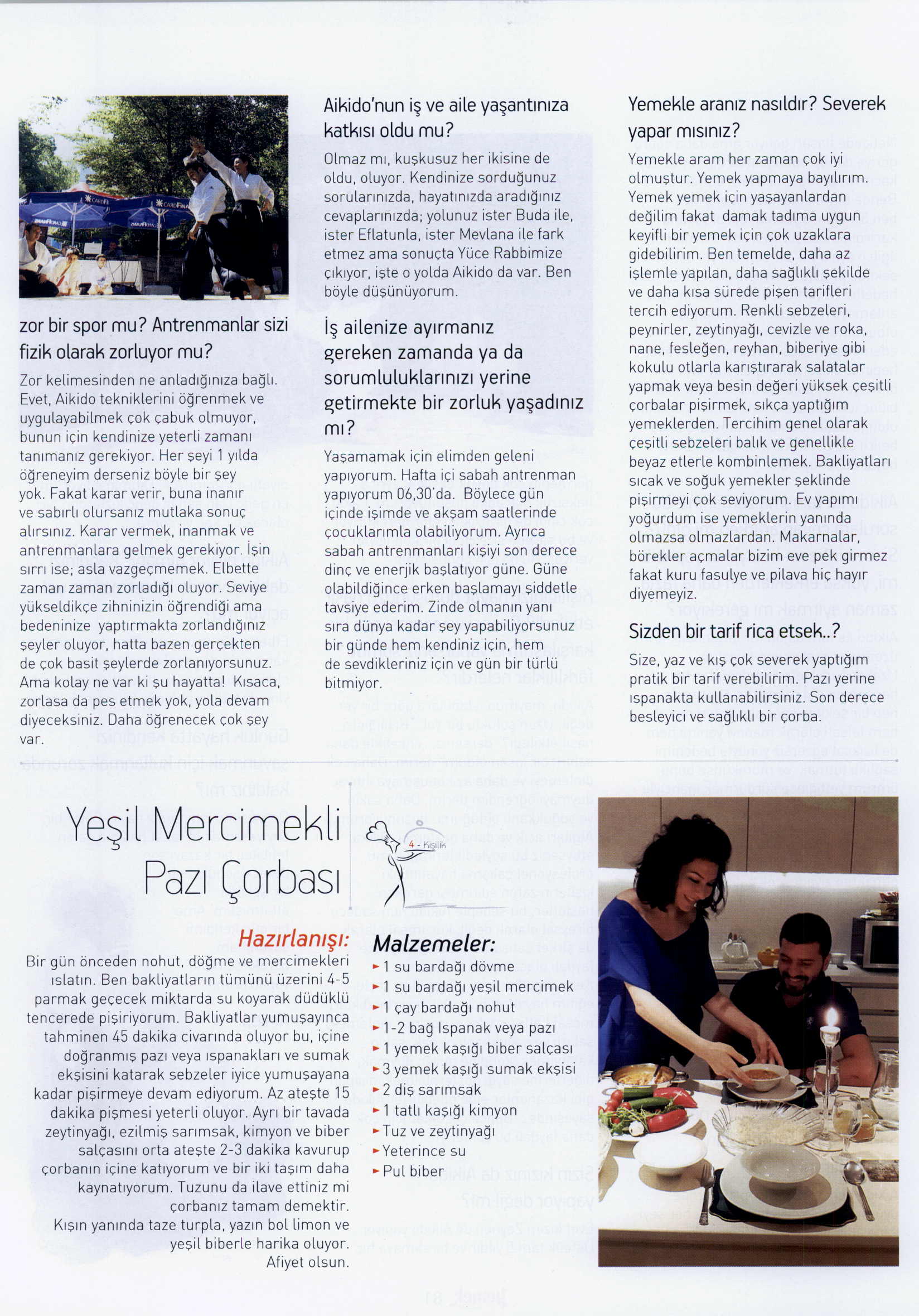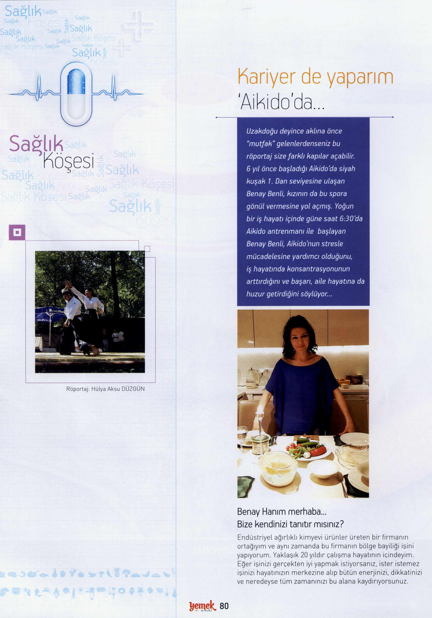 Uzakdoğu deyince aklına önce ‘’mutfak’’ gelenlerdenseniz bu röportaj size farklı kapılar açabilir. 6yıl önce başladığı Aikido’da siyah kuşak 1.Dan seviyesine ulaşan Benay Benli, kızının da bu spora gönül vermesine yol açmış. Yoğun bir iş hayatı içinde güne saat 06 .30 ‘da Aikido antreman ile başlayan Benay Benli , Aikido’nun stresle mücadelesine yardımcı olduğunu, iş hayatında konsantrasyonun arttığını ve başarı, aile hayatına da huzur getirdiğini söylüyor ..