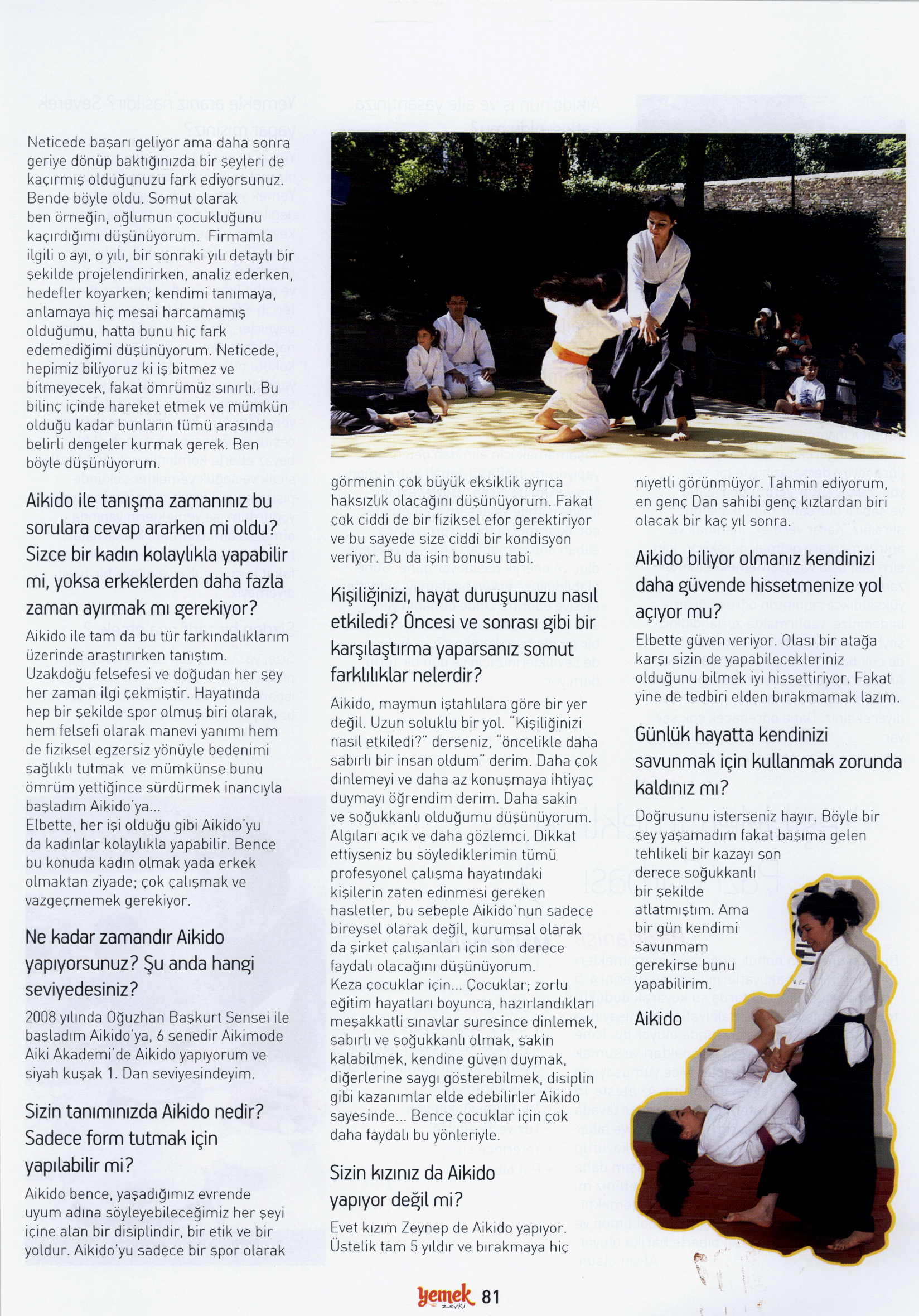 Evet kızım Zeynep de Aikido yapıyor. Üstelik tam 5 yıldır ve bırakmaya hiç niyetli görünmüyor. Tahmin ediyorum en genç Dan sahibi genç kızlardan biri olacak birkaç yıl sonra.